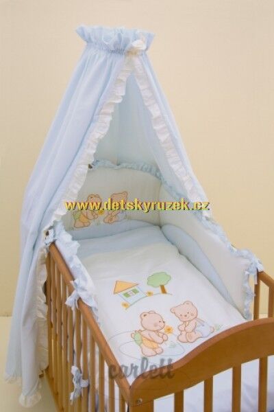 Souprava obsahuje: povlečení na peřinku 100 x 135 cm, povlečení na polštář 60 x 40 cm a ochranný límec okolo 2/3 postýlky, nebesa.