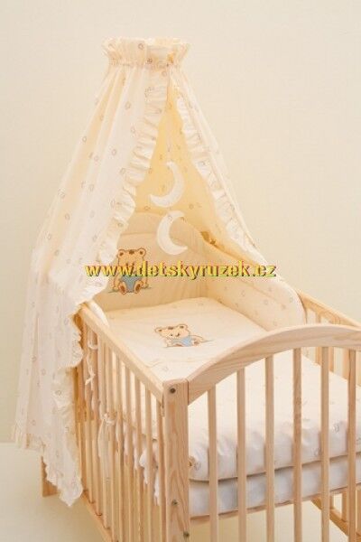Souprava obsahuje: povlečení na peřinku 100 x 135 cm, povlečení na polštář 60 x 40 cm, ochranný límec okolo 2/3 postýlky a nebesa.