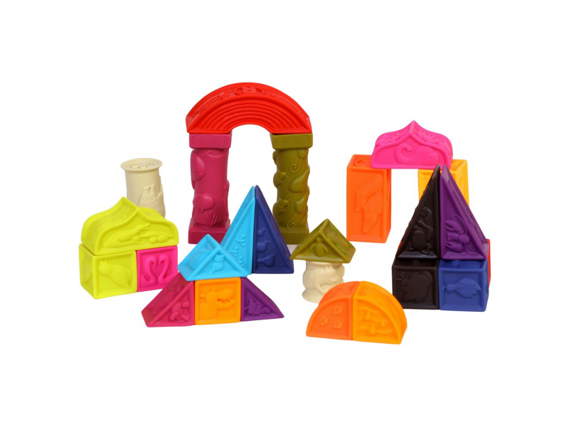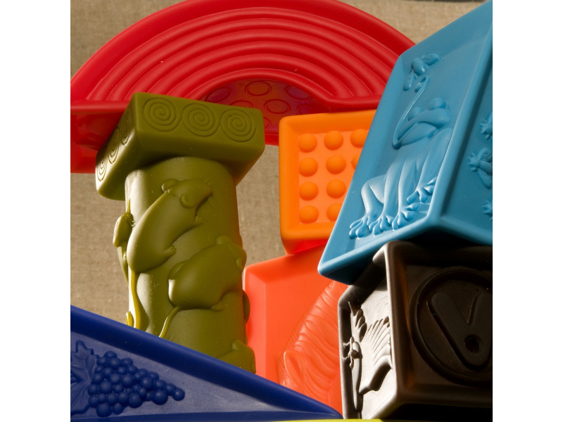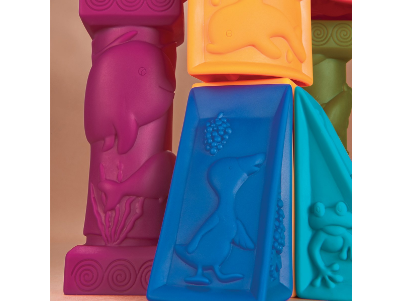 Kostky Elemnosqueeze od Btoys – vhodné pro děti od 6 měsíců do 3 let. 26 kusů „kostek“ různých tvarů, barev a velikostí s písmeny a zvířaty. Měkký plastový materiál, po zmáčknutí pískají. Dítě si s kostkami může házet, stavět z nich, učit se písmenka a názvy zvířátek. V dárkové tašce na zip s držadlem do ruky pro snadné uklízení i přenášení. Taška textilního vzhledu je vyrobena z recyklovaného polypropylenu. Taška může být používána i na jiné hračky, malovací potřeby apod., ideální na cesty s dítětem. Pokud se tašky chcete zbavit, jednoduše odstřihněte zip a vinylovou přední stranu, PP „textilie“ je nejen recyklovatelná, ale i biologicky odbouratelná.