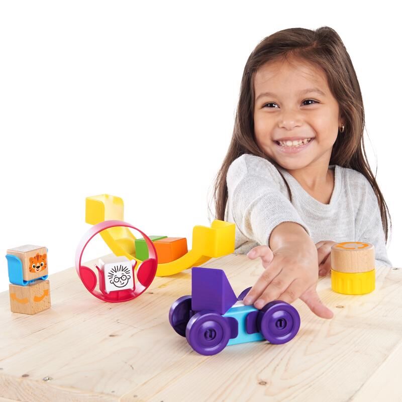 BABY EINSTEIN Dřevěná stavebnice Curious Creations Kit HAPE podporuje rozvoj jemných pohybových dovedností dítěte