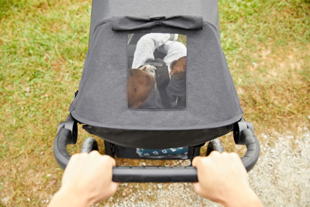 Dlouhá bouda s UV 50 ochranu, peek-a-boo okýnkem na magnet udrží vaše dítě ve stínu a přitom pod vaším neustálým dohledem.