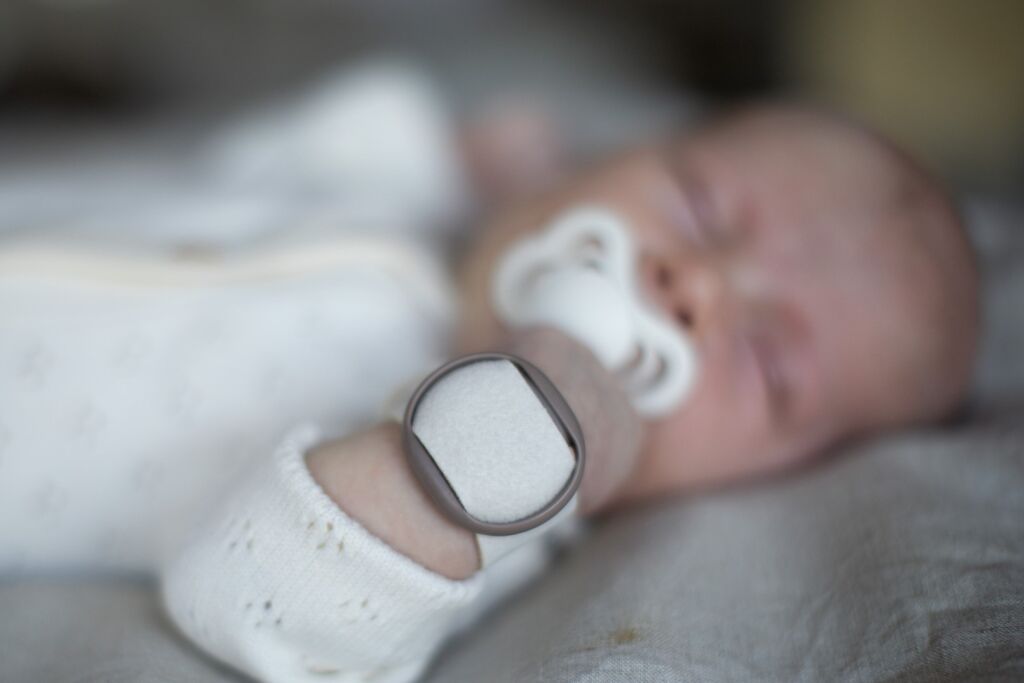 Kontroluje potřeby péče o dítě: Pomocí pohodlného senzoru připevněného na paži nebo noze dítěte se měří informace o péči, jako je saturace kyslíkem, srdeční frekvence a teplota kůže.