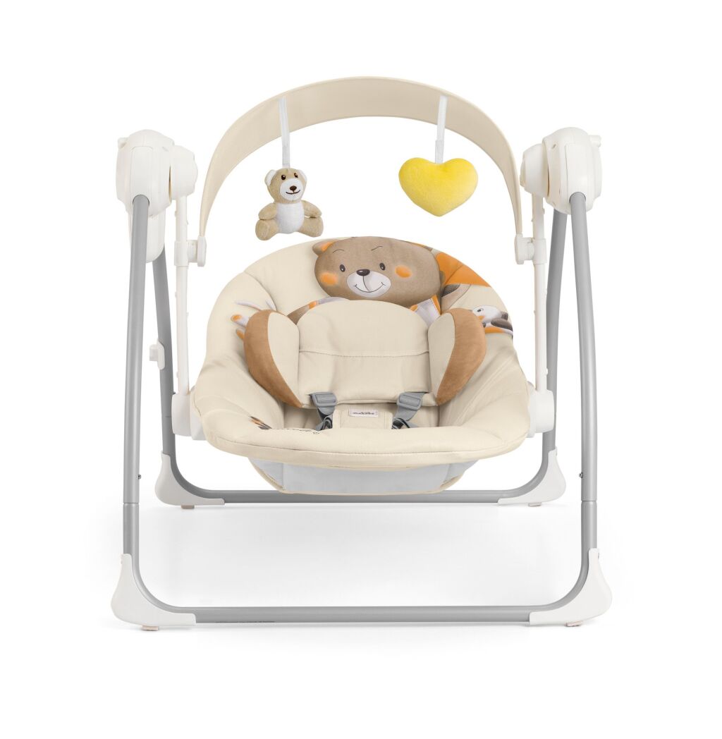 má měkký potah z látky opěradlo je nastavitelné do 2 různých poloh sluneční stříška s nastavitelnou výškou Má dvě plyšové hračky, 3 různé rychlosti houpání, automatické vypnutí - opět nastavitelné po 10, 20 nebo 30 minutách.