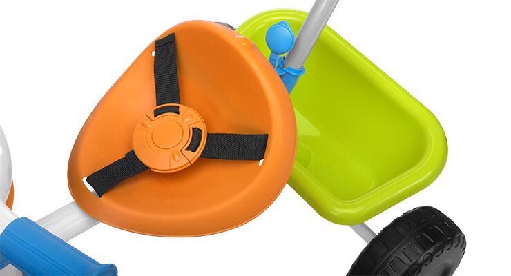 - maximální bezpečnost od prvního použití díky uzamykatelným řidítkům, bezpečnostnímu pásu a uzamknutí předního kola ( dítě může volně šlapat i když je tlačené rodičem ).