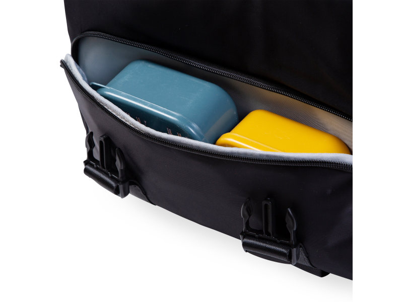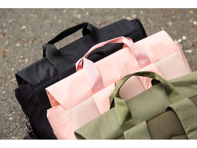 Polstrovaná záda ze síťoviny zajišťují cirkulaci vzduchu při kontaktu s tělem. Nastavitelné ramenní popruhy mají ergonomický tvar S, takže lépe drží na svém místě. Držadlo umožňuje nošení tašky v ruce. Ve spodní části tašky jsou malé kovové cvočky, aby se dno tašky nedotýkalo přímo země.
