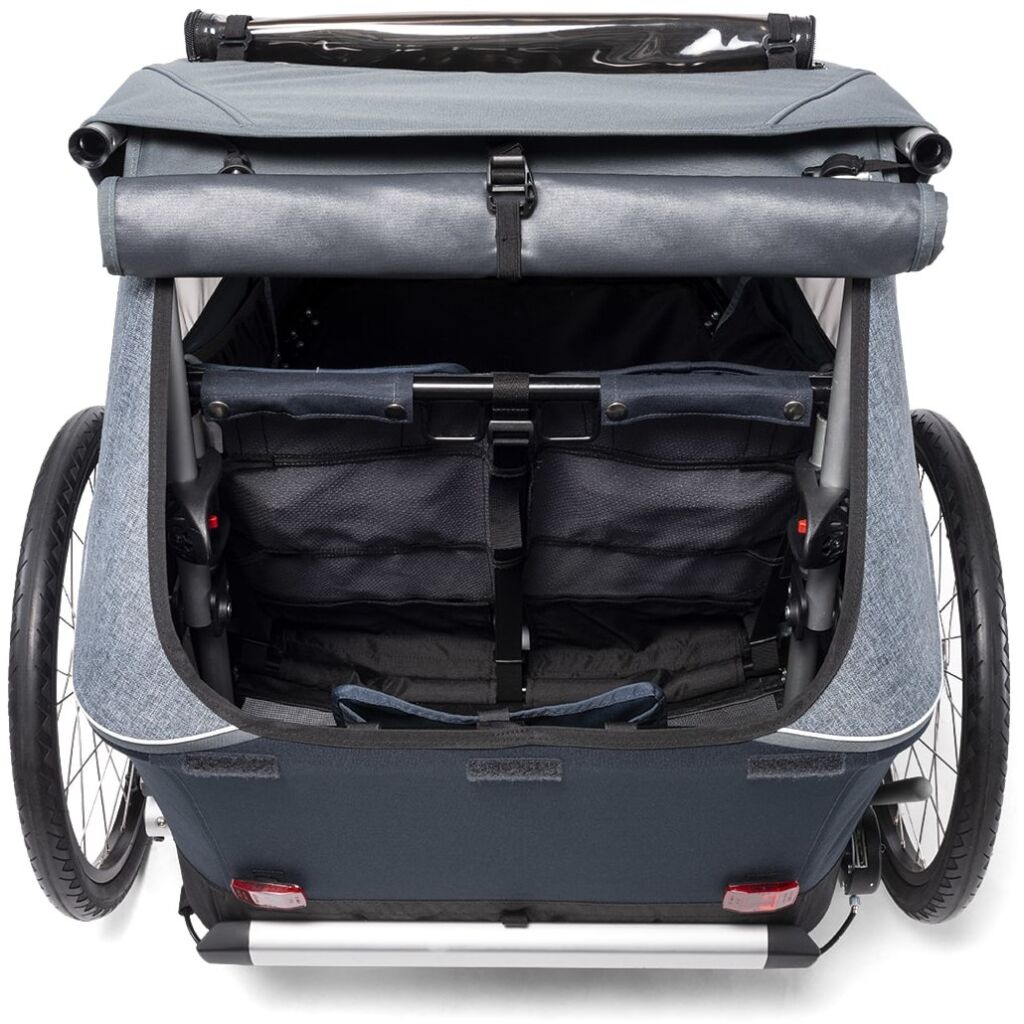 Croozery jsou vybaveny kombinovaným krytem proti hmyzu a vlivům počasí: nad sítí proti hmyzu je rolovatelný PU potah, takže vaši malí pasažéři jsou také chráněni proti chladnému či vlhkému počasí.