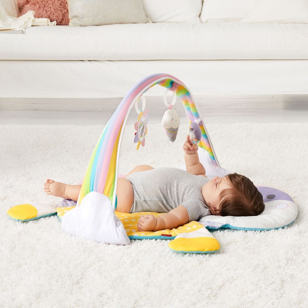 Díky vývojovým aktivitám deka na hraní s motivem jednorožce vytváří měkounký plyšový magický prostor pro děti.