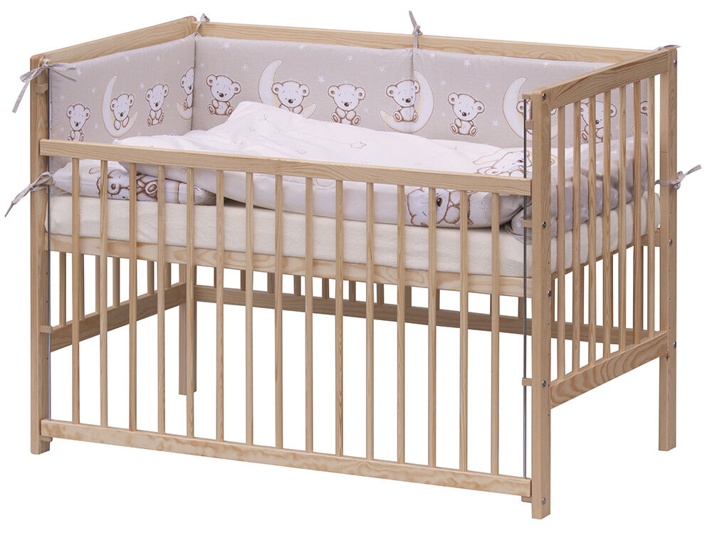 1 . Dětská dřevěná postýlka 120x60 cm - přírodní, masiv borovice, stahovací bok, 6 poloh roštu, nohy postýlky jsou předvrtané pro možné nasazení koleček