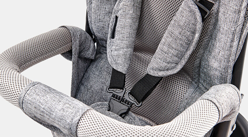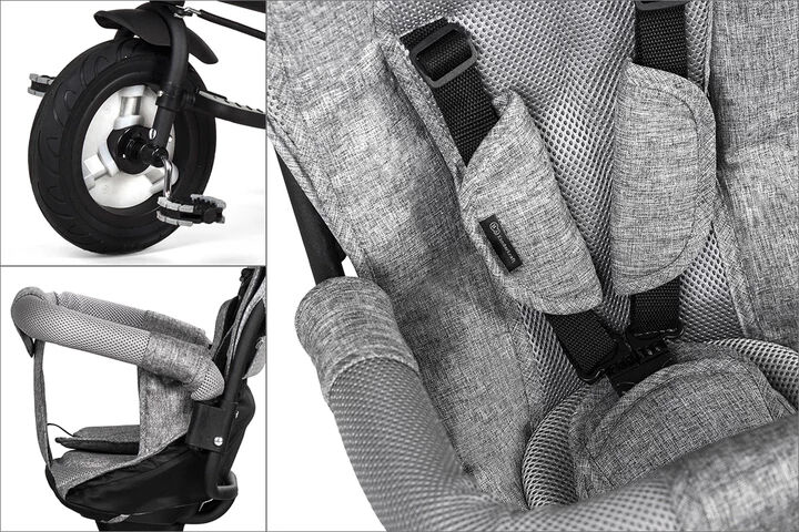 Tříkolka je vybavena nastavitelnými, 3-bodovými bezpečnostními pásy a bezpečnostní zábranou. Pásy mají měkké chrániče a pásek v rozkroku lze snadno připevnit k zábraně, čímž zvýšíte bezpečnost dítěte.