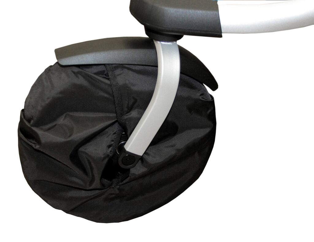 Návlek z omyvatelného materiálu na kolo kočárku pro ochranu interiérových prostor před nečistotami. Zapínání na suchý zip, díky šňůrkám se přizpůsobí velikosti kola až do průměru 36 cm.