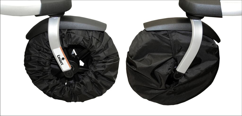 Návleky na kola ochrání interiér bytu a nebo auta před ušpiněním koly kočárku. Speciální střih umožňuje použít návlek pro většinu typů kol až do průměru 36 cm. Doporučujeme na přední otočná kola s vidlicí...