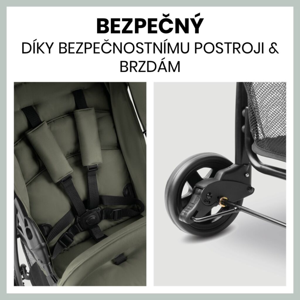 Přední madlo a 5bodový polstrovaný bezpečnostní pás zaručí bezpečnost Vašeho dítěte. Kočárek při zastavení spolehlivě zajistí parkovací brzda. Tento model lze kompaktně složit a uložit i do toho nejmenšího kufru automobilu.