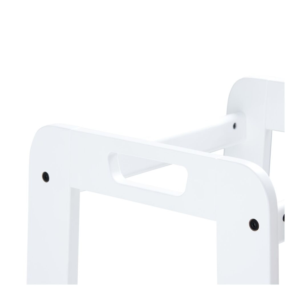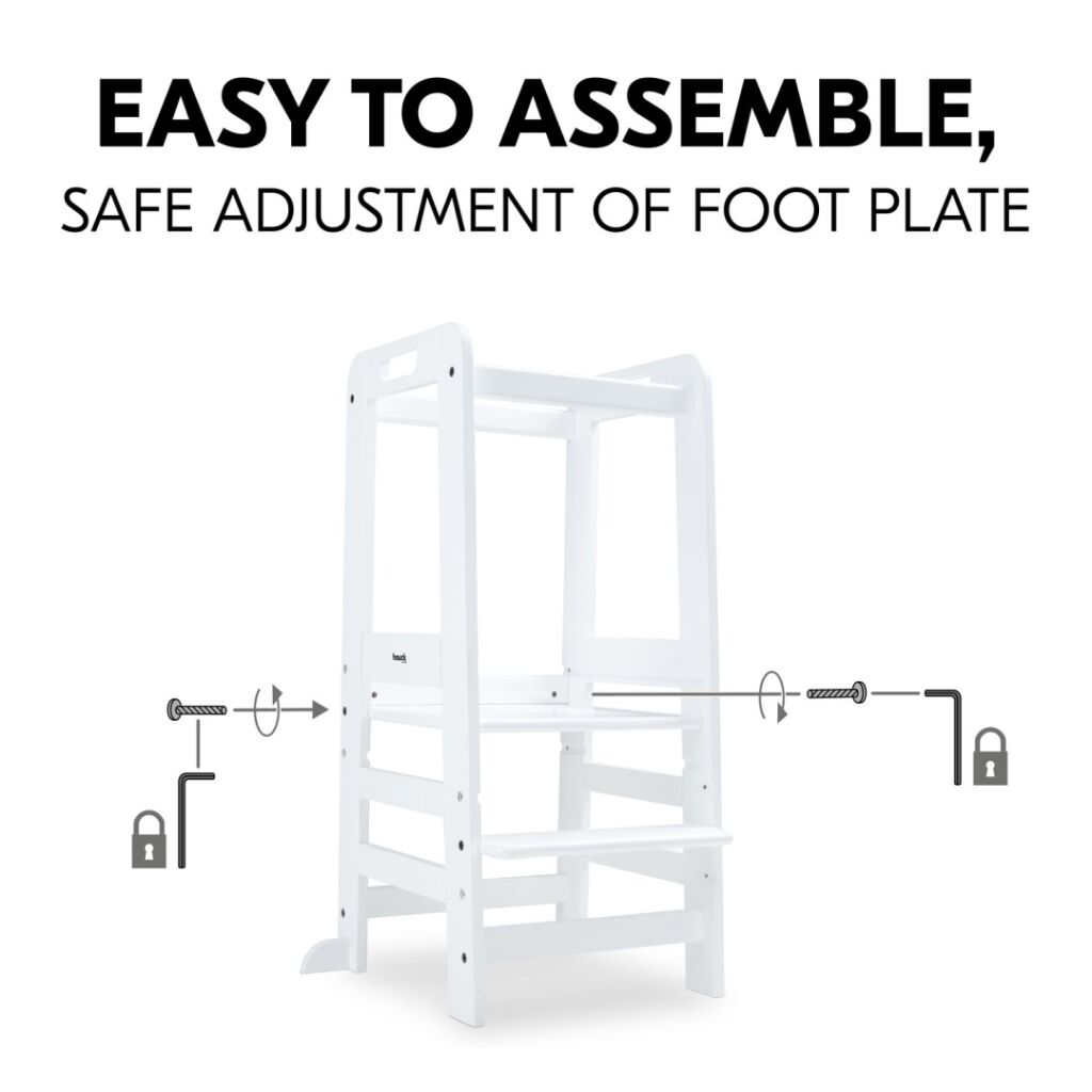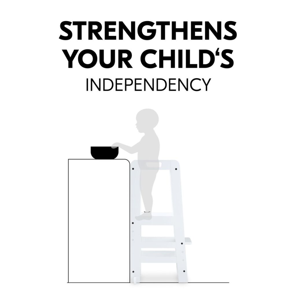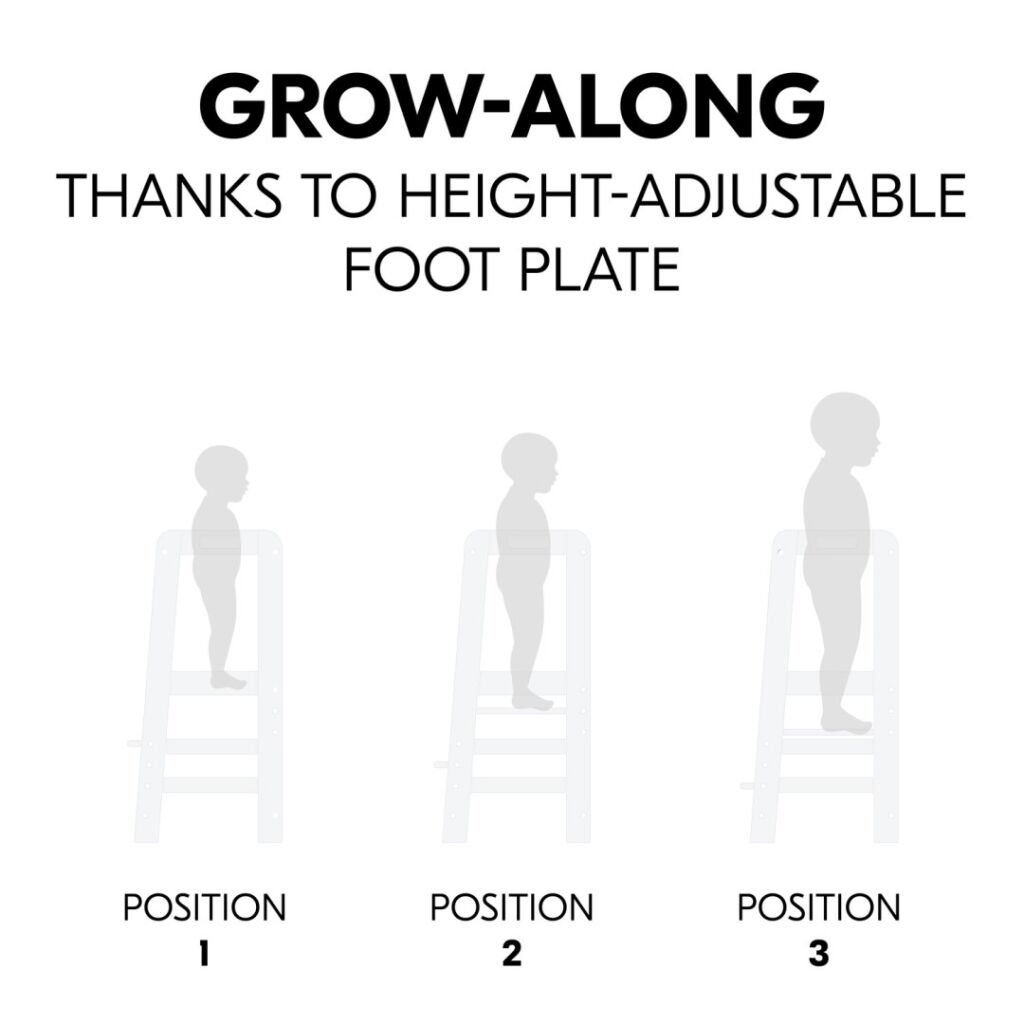 V závislosti na velikosti vašeho dítěte můžete nastavit nožní desku kuchyňského pomocníka do tří různých výšek. Robustní a stabilní konstrukce umožňuje vašemu dítěti používat Montessori věž až do hmotnosti 40 kg, ať už v kuchyni, u jídelního stolu nebo u umyvadla v koupelně.