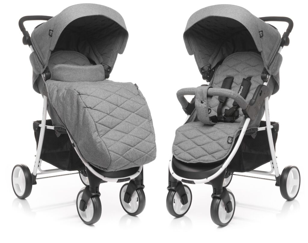 Moderní sportovní kočárek 4Baby Rapid s nánožníkem v ceně.Polohovací záda i opěrka na nohy. Otočná přední kolečka s aretací, prostorný košík, přední ochranné madlo.
