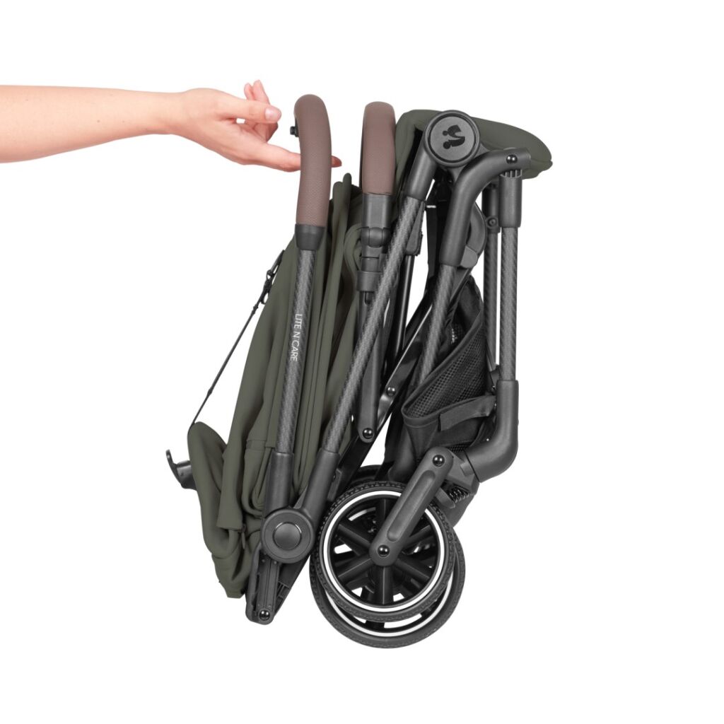 Snadný jednoruční skládací systém. Jeho kompaktní skládaná velikost – 43×52×23 cm – umožňuje vzít kočárek na palubu jako kabinové zavazadlo.