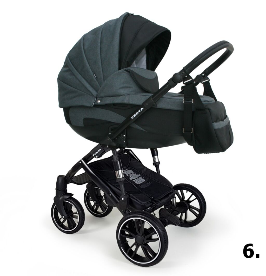 FIRKON VESTA -kombinovaný kočárek skládající se z hluboké korbičky a sportovní nástavby. Doplňky jako je pláštěnka, síťka, taška na rukojeť, držák na lahvičku, koš pod kočárkem, zateplený nánožník jsou ve výbavě kočárku.