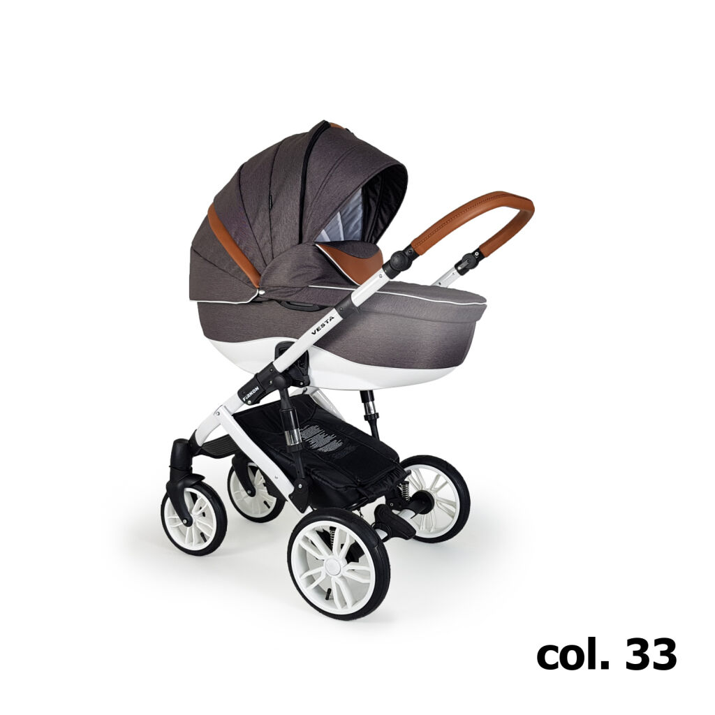 FIRKON VESTA -kombinovaný kočárek skládající se z hluboké korbičky a sportovní nástavby. Doplňky jako je pláštěnka, síťka, taška na rukojeť, držák na lahvičku, koš pod kočárkem, zateplený nánožník jsou ve výbavě kočárku.