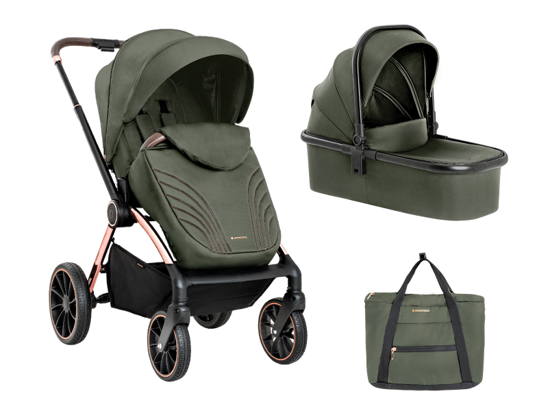 Pohodlný stylový kočárek KikkaBoo Kara obsahuje v kombinaci 2v1 podvozek, sportovní sedák, korbičku, nánožník a přebalovací tašku.