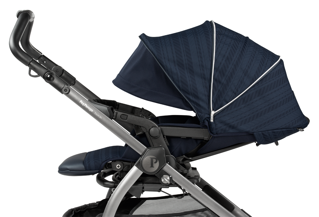 Oboustranně nasazovací sportovní nástavba kočárku Book nabízí pohodlné procházky od narození až do doby, dokud dítě nedosáhne hmotnosti 22 kg. Současné nastavení opěradla a stříšky.