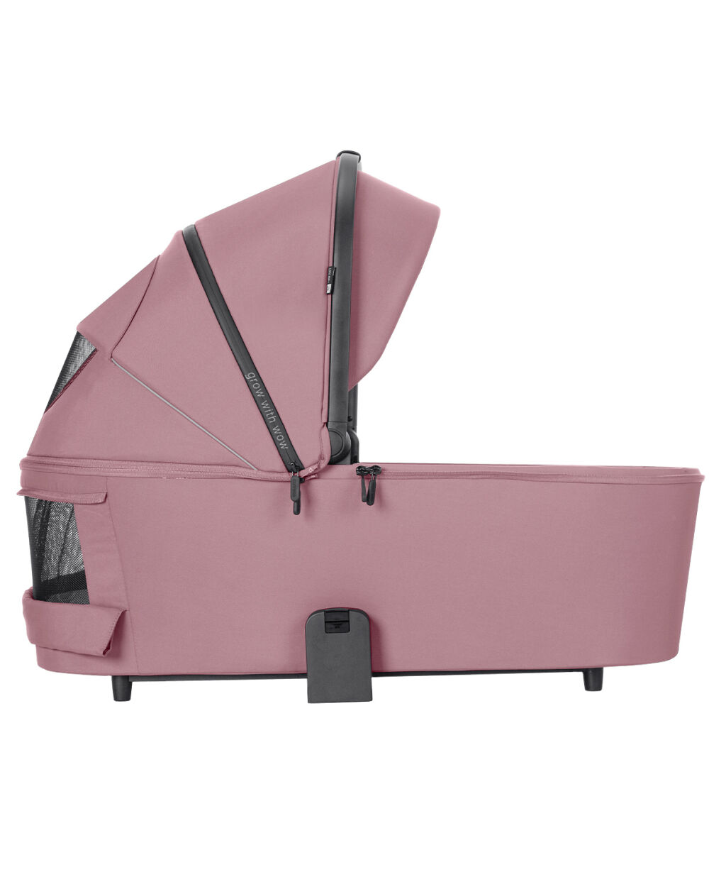 Má také praktické ucho na přenášení, potažené ekokůží a uvnitř najdete měkkou podšívku a matraci. V zadní části gondoly a na samotné kapuci jsou okénka pro větrání v horkých dnech, zapínaná na zipy.