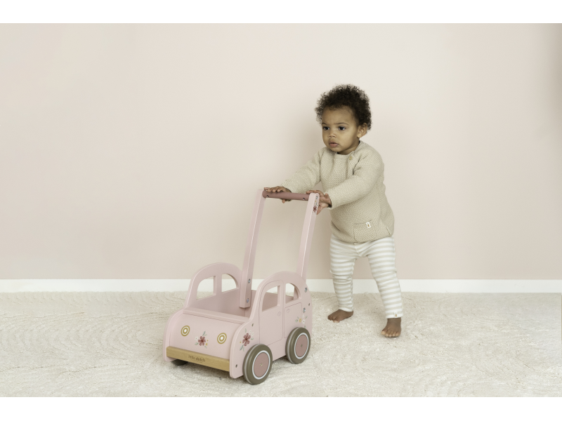 Dřevěný vozík v podobě růžového auta s krásným květinovým potiskem je jako stvořený pro převážení oblíbených hraček, plyšáků apod.