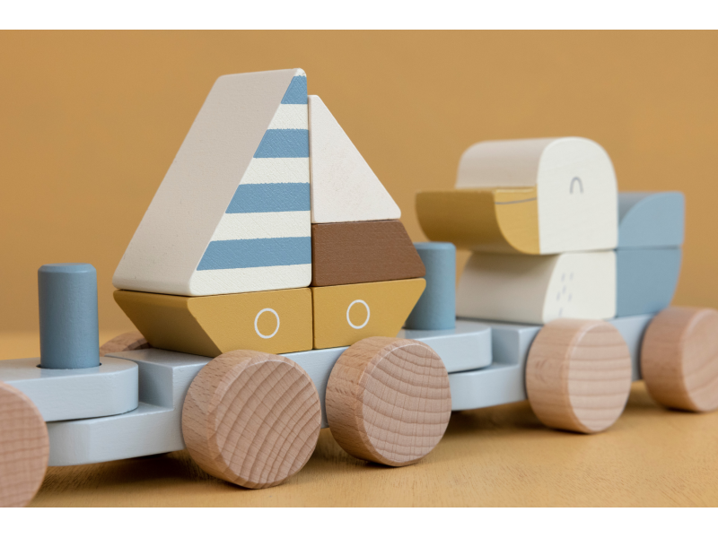 Originální dřevěný vláček z dílny Little Dutch je tvořen kostkami různých barev ve tvaru parníku, plachetnice a racka. Kombinováním kostek si vaše dítě může sestavovat různé varianty vagónů dle své fantazie.