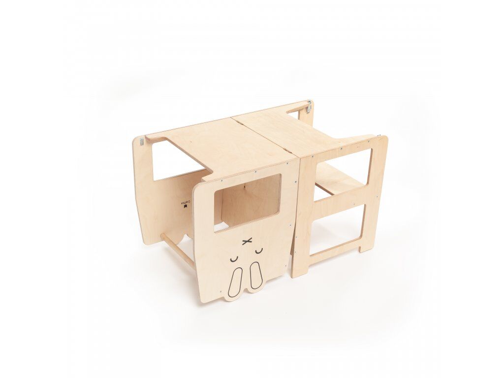 Učící věž Craffox je víceúčelová. Slouží nejen jako kuchyňská učící věž, ale snadnou přestavbou se z věže stane stůl se židlí pro jedno nebo dvě děti. Na zadní straně věže je křídová tabule, na které mohou děti rozvíjet svoje výtvarné umění.
