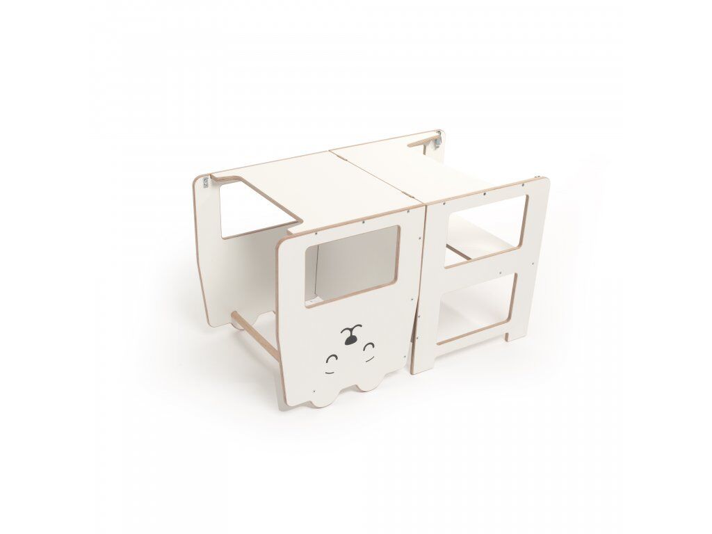 Přestavba věže je jednoduchá. Stačí odklopit boční spony a jednou rukou sklopit horní část. Rázem se z učící věže Craffox stane stůl, který mohou využívat i dvě děti současně. Učící věž Craffox je zcela ideální do malých bytů, kde bude plnit několik funkcí najednou a nemusíte tak kupovat učící věž, dětský stůl, židli, případně tabuli zvlášť. Spony slouží k upevnění věže v obou polohách. Přestavovat věž z jedné pozice do druhé mohou pouze rodiče.