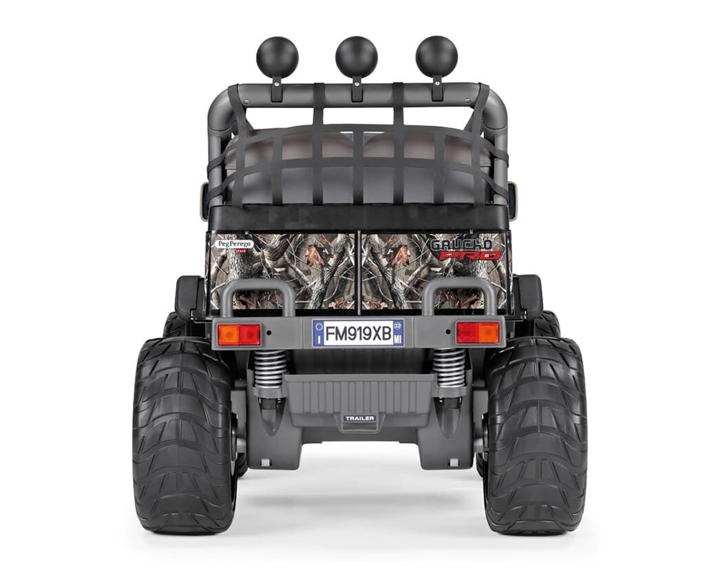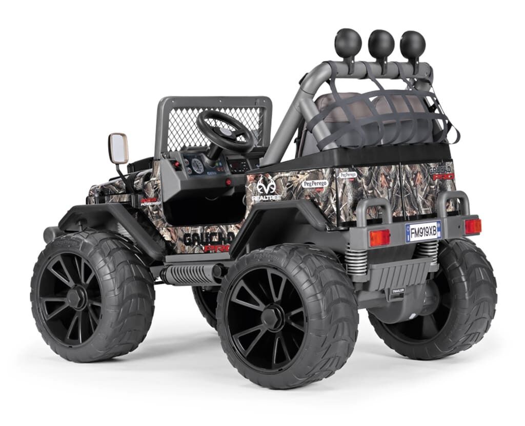 Dvoumístné dětské elektrické vozítko GAUCHO PRO Real Tree 24V italské firmy Peg Perego. Elektrické autíčko je určeno dětem od 6 let, ale bravurně ji zvládají i tříletí řidiči. Dostatečný výkon motorů (840W) a baterie (24V12Ah) postačuje na minimální dobu jízdy 35 minut a rychlost 6 km/h a 12 km/h vpřed a 6 km/h vzad.
