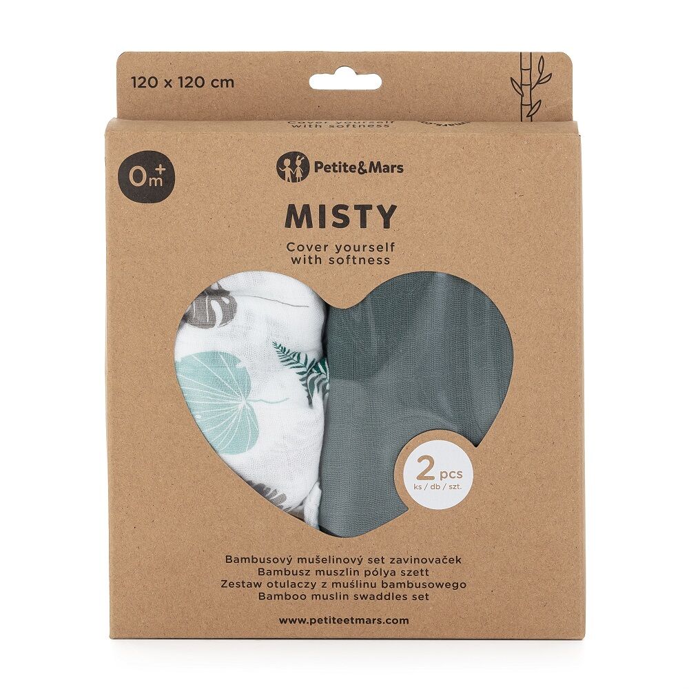 PETITE&MARS 2ks bambusová mušelínová přikrývka-osuška 2v1, 120 x 120 cm - Misty Green Leaves
