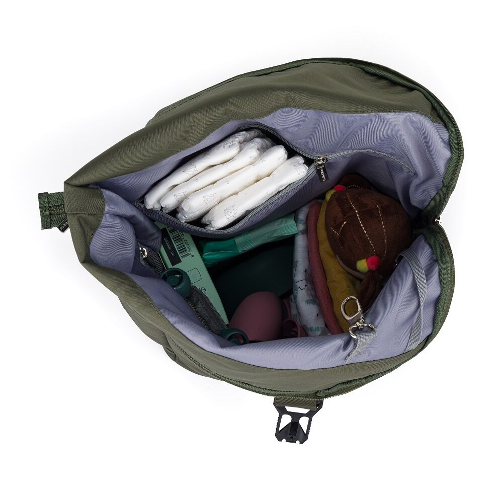 Tento pohodlný a organizačně promyšlený batoh je vyroben z kvalitních materiálů odolných vůči vlhkosti. Má boční popruhy pro připevnění ke kočárku a hlavní prostor se zapíná na zip, který přechází přes vrch a bok batohu. Díky tomu se batoh otevírá dokořán a vy si můžete důkladně prohlédnout obsah a pohodlně sáhnout po předmětu, dokonce i hluboce ukrytém. Kromě toho má horní část batohu rolovací zapínání s magnetickou přezkou, které kombinuje výhody tradičních uzavíracích mechanismů s moderní magnetickou technologií. Přezka patentovaná Fidlockem funguje na principu přitahování magnetů, díky čemuž je její ovládání mimořádně intuitivní a rychlé. Otevírá se jednoduše potažením za přezku z nerezavějící oceli. Jednoduché a bezpečné řešení umožňuje rychlý přístup k obsahu batohu bez potřeby síly. Chcete-li přezku zapnout, jednoduše spojte dvě části k sobě. Silné magnety automaticky zapadnou do spony a zajistí pevné a bezpečné zapínání.