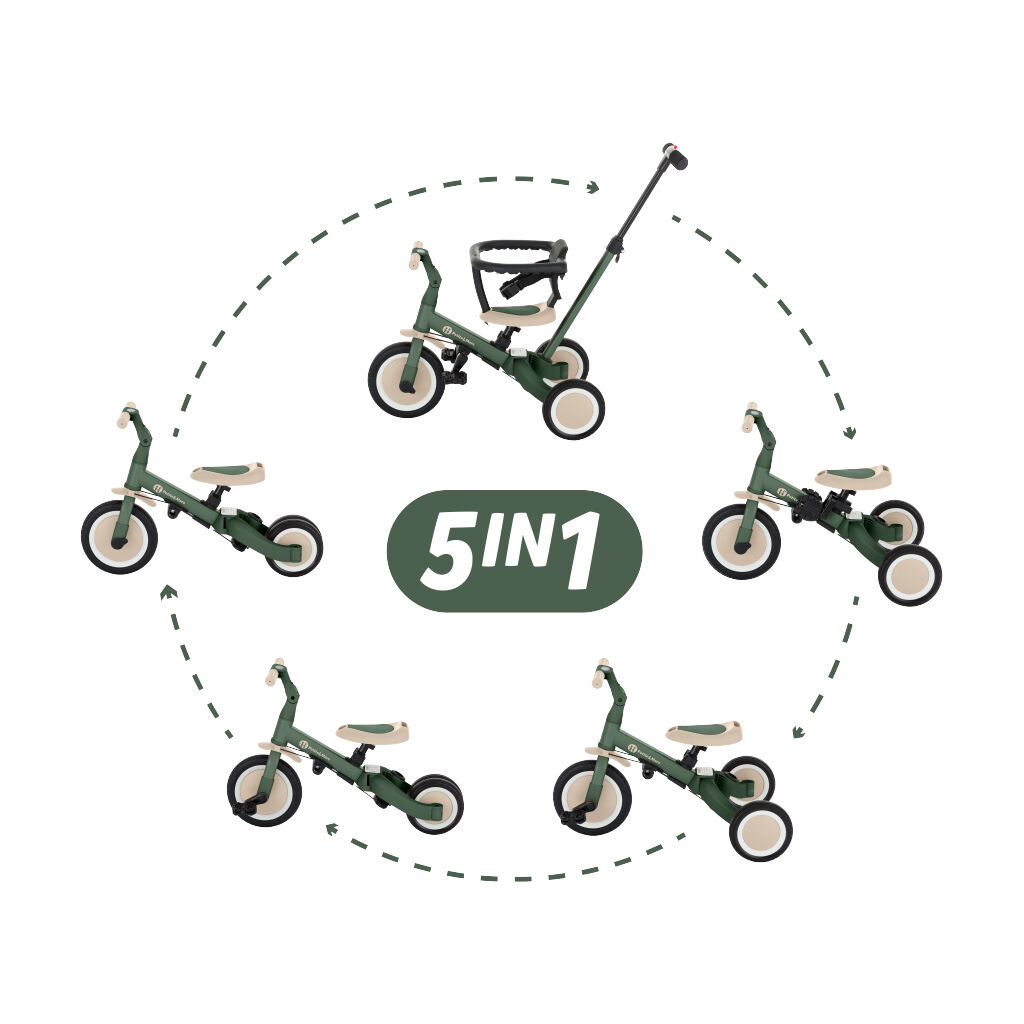 Multifunkční tříkolka určená pro děti od 1,5 do 5 let nebo do 25 kilogramů. Je to nejen dopravní prostředek pro přesun a učení se rovnováhy, ale také společník pro rostoucí dítě během mnoha vývojových fází. Promyšlené měnění se kola se přizpůsobuje potřebám děťátka podle toho, jak se vyvíjejí jeho motorické schopnosti. Zpočátku je to tříkolka s možností asistence rodiče, zatímco konečná verze je standardní kolo s pedály, bez jakýchkoli dalších podpůrných prvků. Díky takovým změnám můžete pomoci svému dítěti naučit se jezdit na dvou kolech.