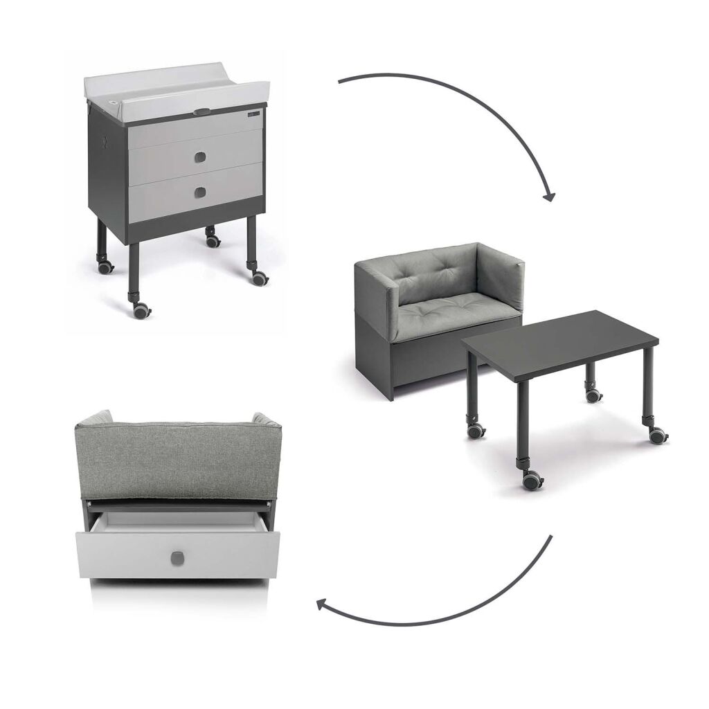 V momentě, kdy dítě již nebude přebalovací pult potřebovat, lze komodu jednoduše přestavět na praktickou dětskou pohovku s úložným prostorem a stolkem, kde může dítě odpočívat či si hrát nebo malovat. Měkké polstrování gauče je součástí balení.