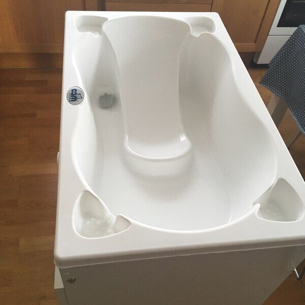- Stůl je vybaven vaničkou se 2 anatomickými sedátky (jedna opěrka pro miminka od 0 do 6 měsíců a druhá s područkami pro děti od 6 do 12 měsíců) a s držáky na houbu a mýdlo.
