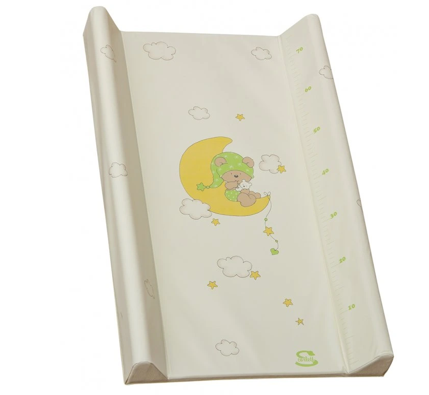 Přebalovací podložka s pevnou vložkou z MDF a profilovanými okraji z kvalitním PVC potahem bez ftalátů, vyplněná molitanem. Podložka má zarážky které brání pohybu při položení na postýlku