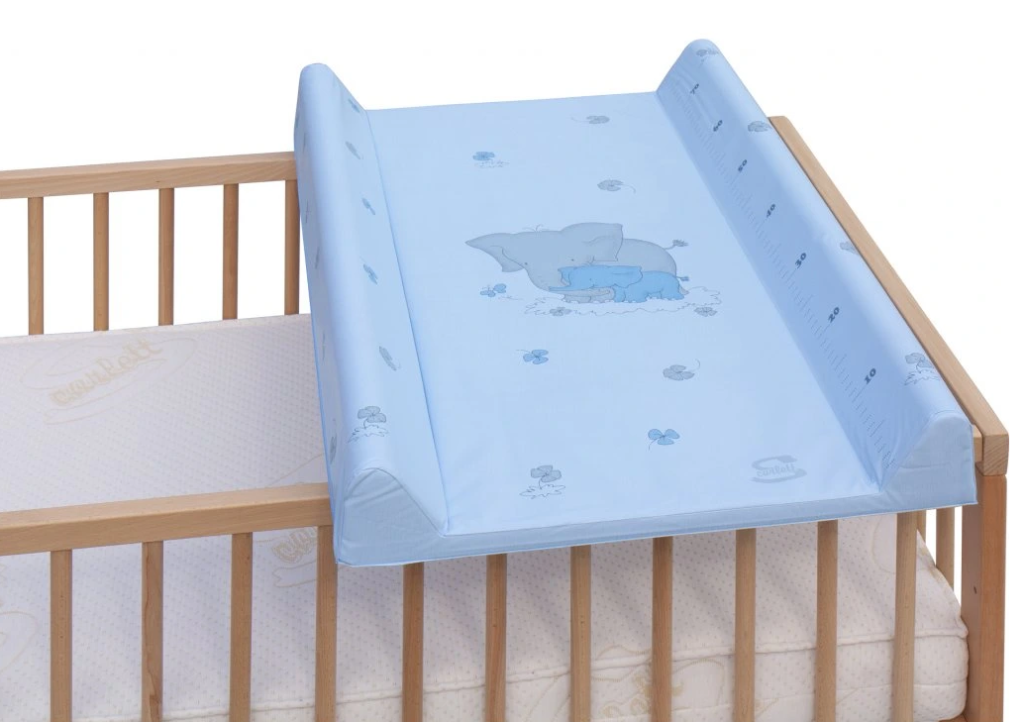 Přebalovací podložka s pevnou vložkou z MDF a profilovanými okraji z kvalitním PVC potahem bez ftalátů, vyplněná molitanem. Podložka má zarážky které brání pohybu při položení na postýlku