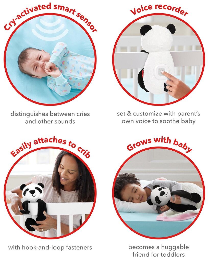 Inteligentní senzor pláče v podobě jednorožce uklidní děťátko sladkými písněmi, zvuky přírody a nahraným hlasem - dokonce i uprostřed noci! Tento plyšový přítel automaticky reaguje na pláč a křik děťátka, aby ho uklidnilo, čímž se miminko a i rodiče v noci lépe vyspí. Jednoduše jej připojte k postýlce. Přehrává 3 ukolébavky a 3 uklidňující zvuky. Umožňuje rodičům nahrát hlasový záznam až po dobu 20 minut. Plyšový přítel roste spolu s děťátkem a bude jeho nedílným společníkem.