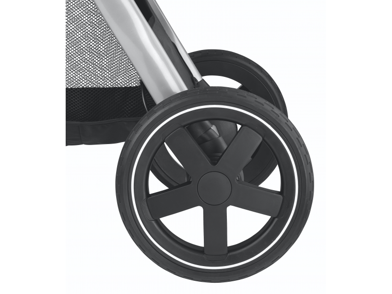 - Přední kola kočárku jsou otočná o 360° a lze je snadno zaaretovat pro plynulou jízdu