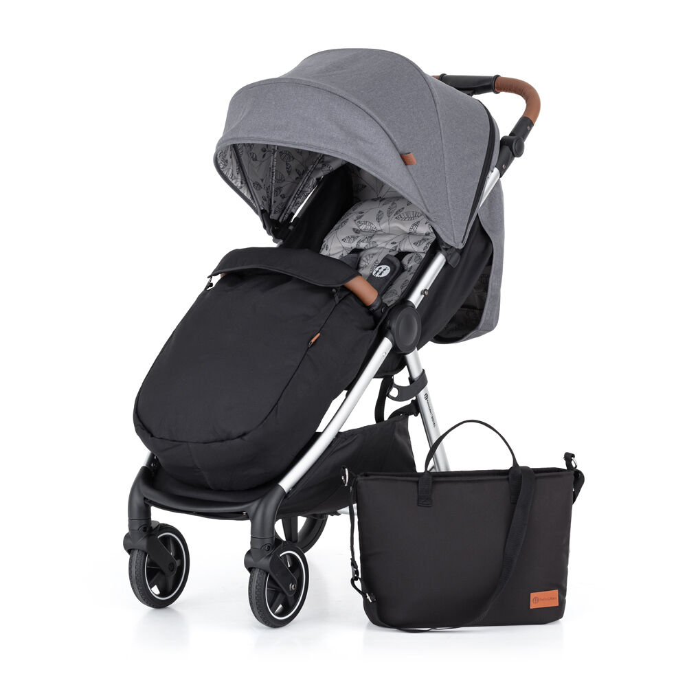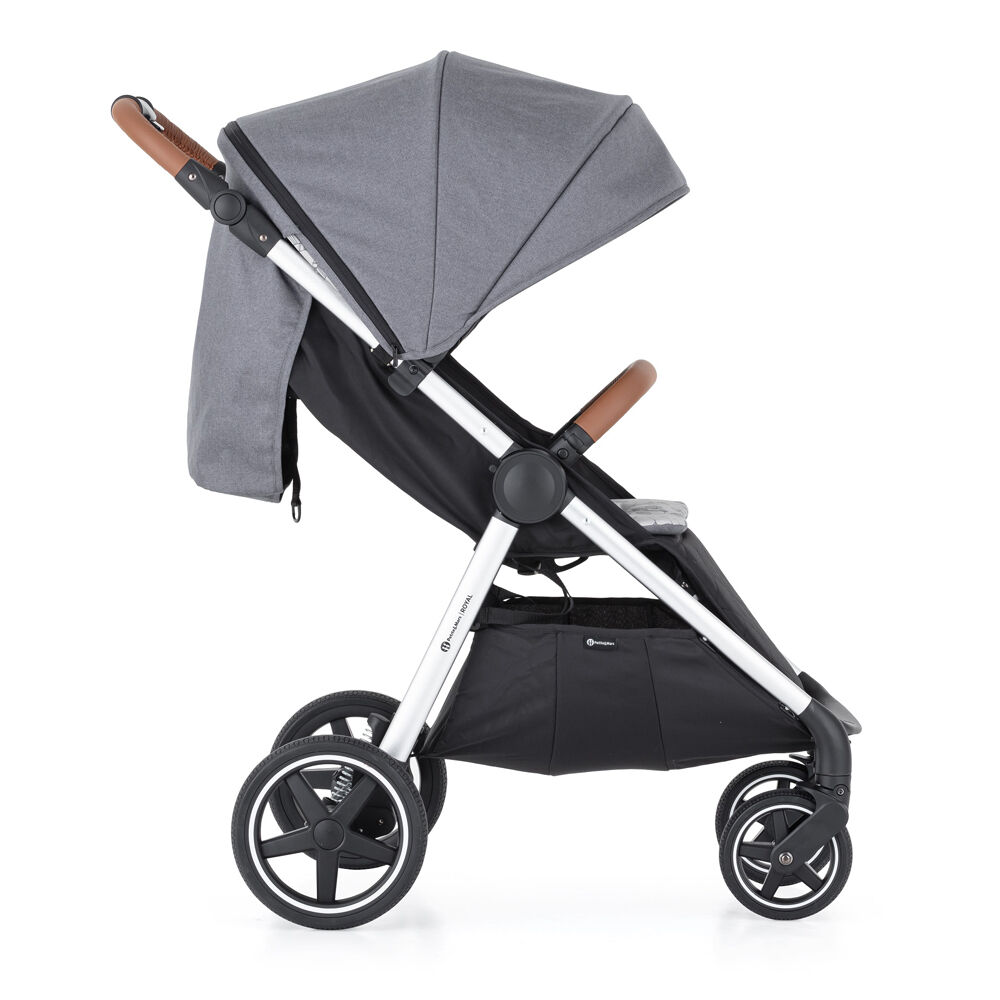 - Konstrukci kočárku ve stříbrné barvě s madlem a rukojetí v hnědé eko-kůži