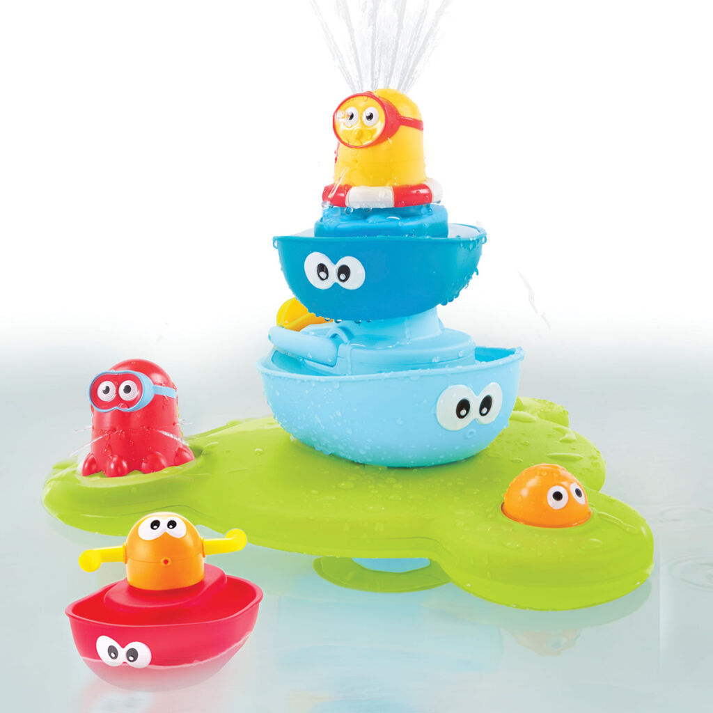 Yookidoo Zábavná fontána - zábavné proudy vody nejen ve vaně! Základna hračky se připevní na dno vany a středem čerpá vodu. Tím vytváří magickou fontánu. Lodě a postavičky se mohou na sebe stavět libovolně jak dítě napadne.