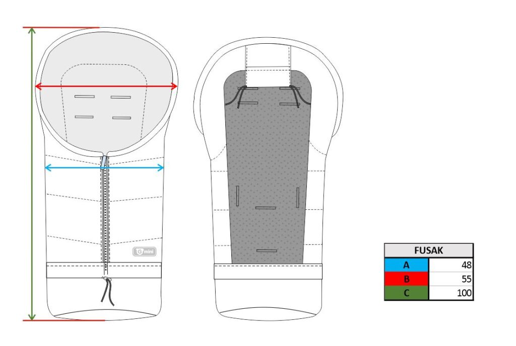 - v zadní části fusaku jsou umístěny otvory pro provlečení bezpečnostních pásů do kočárků a autosedaček různých značek